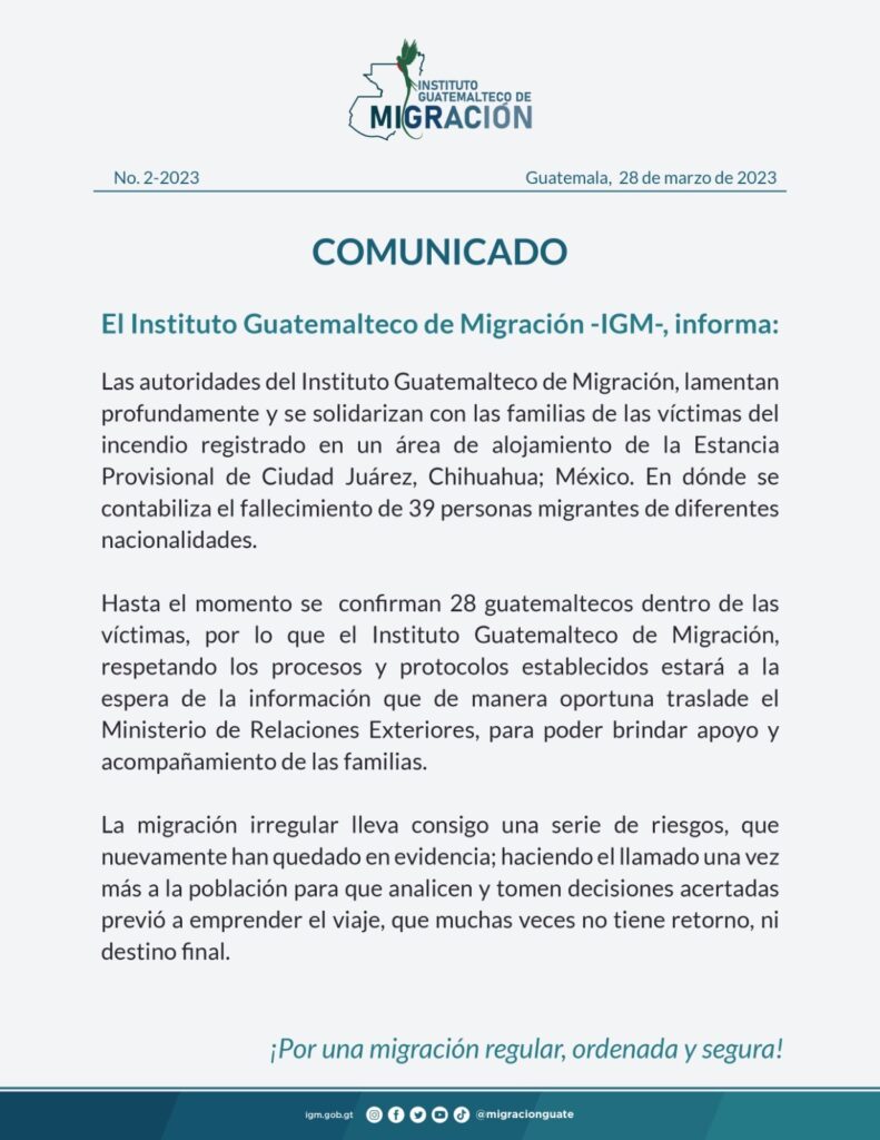 Chihuahua, Chih.- El Gobierno de Guatemala informó hace unos momentos a través del Instituto Guatemalteco de Migración, que 28 de las 39 víctimas mortales del incendio en el INM de Ciudad Juárez, son ciudadanos de dicho país.