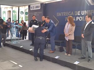 Chihuahua, Chih.- En las inmediaciones de la Plaza de Armas, el Presidente Municipal, Marco Bonilla encabezó la entrega de mil 404 nuevos uniformes y 130 chalecos balísticos de