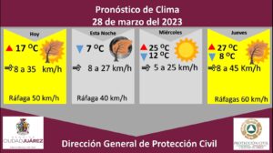 La Dirección General de Protección Civil, con base en informes del Servicio Meteorológico Nacional, emite una alerta amarilla para este martes debido a fuertes ráfagas de viento que