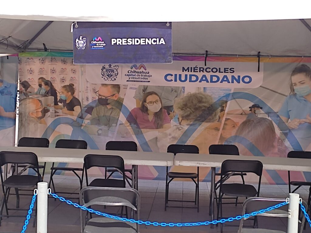 Chihauhua, Chih.- Ya está todo listo en la Plaza de Armas para una edición más del “Miércoles Ciudadano” el cual es un programa de atención directa del Gobierno Municipal en el que el Alcalde y los Directores de las diferentes dependencias estarán recibiendo peticiones desde las 5 de la tarde hasta las 8 de la noche, el día de hoy.
