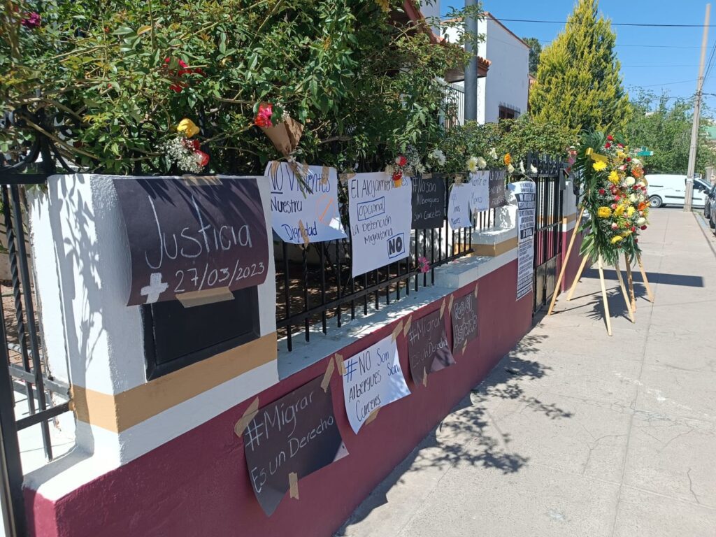 Personas defensoras de los derechos de los migrantes colocaron varias cartulinas a las afueras de las instalaciones del Instituto Nacional de Migración, ubicado en la calle 4ta y Mariano Irigoyen en el centro de la ciudad de Chihuahua.