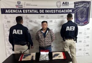 La Agencia Estatal de Investigación capturó a un sujeto que fue sorprendido en flagrancia en posesión de dos armas de fuego tipo pistola y 13 bolsas con enervante.