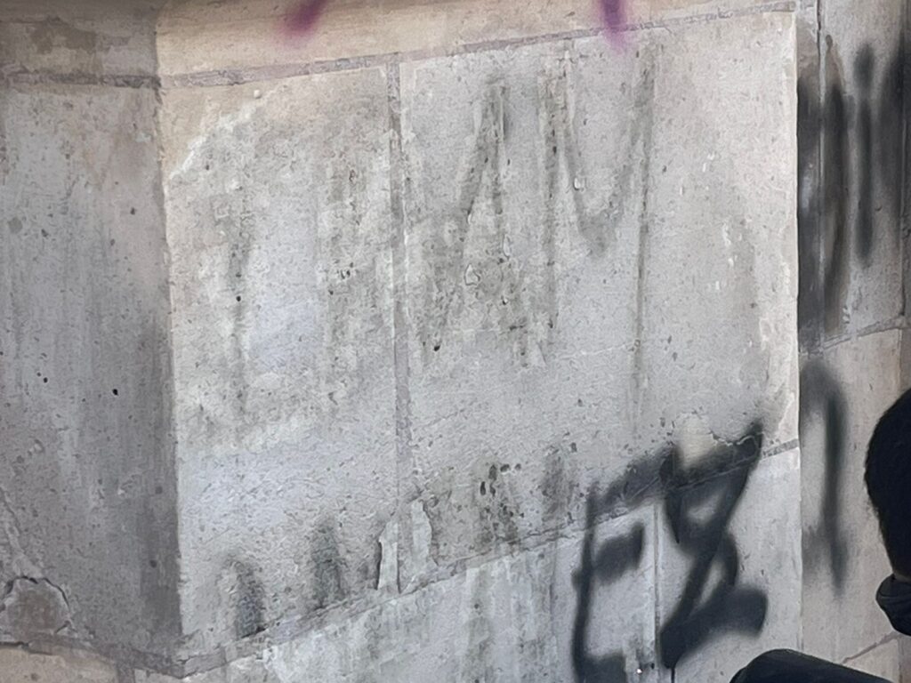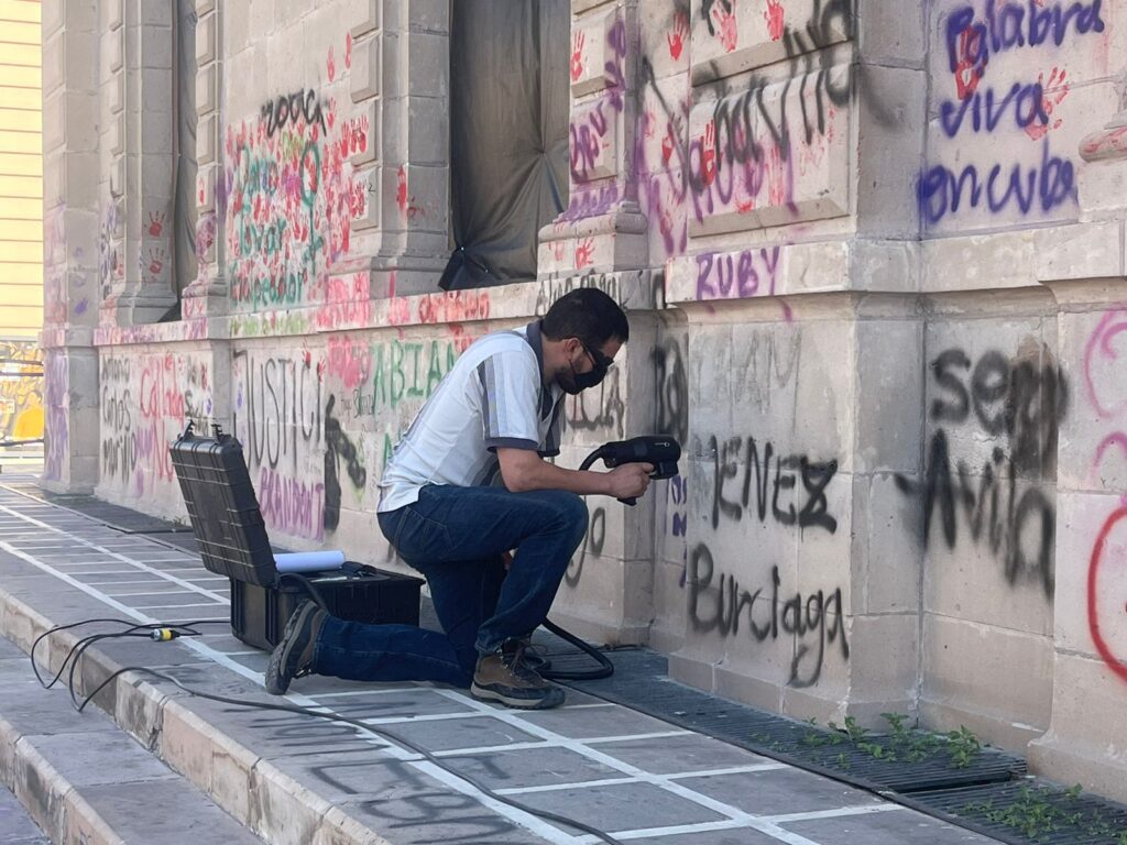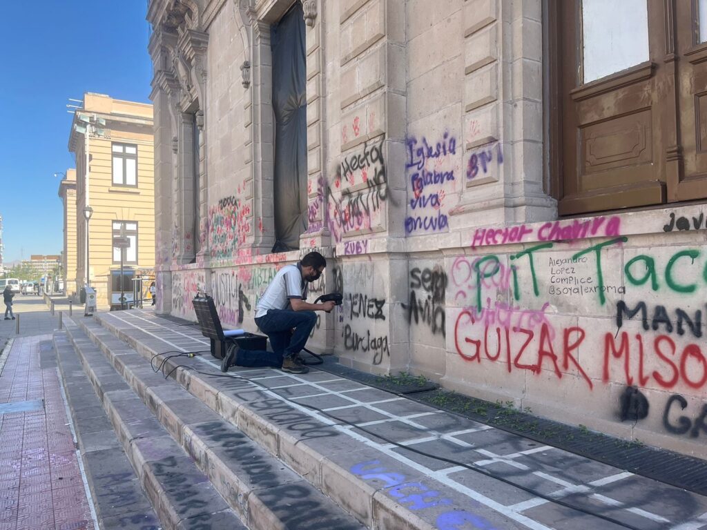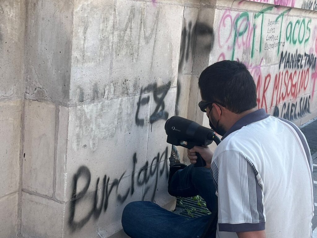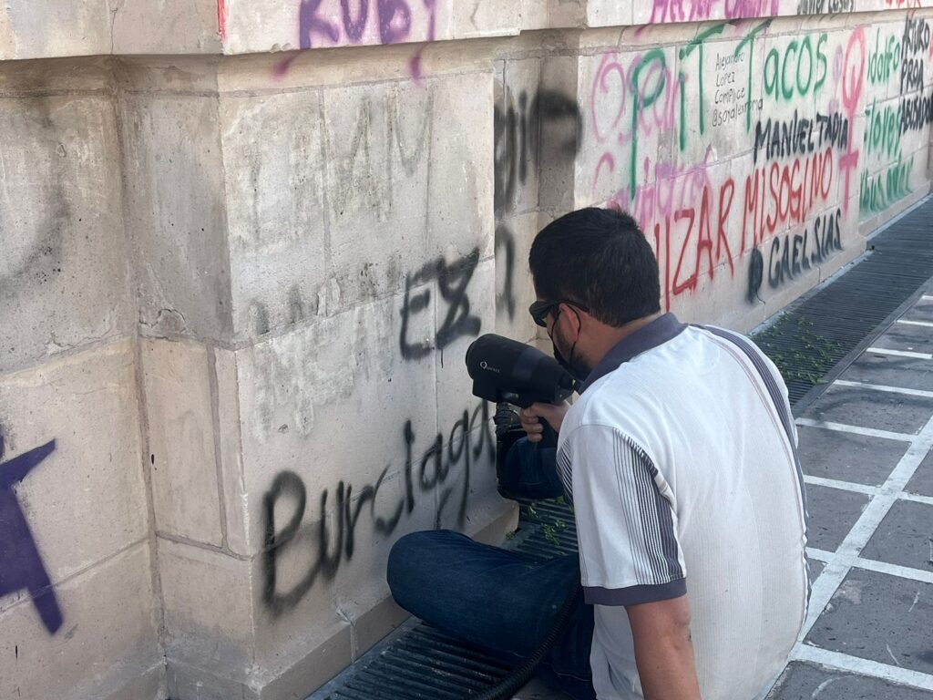 En las instalaciones de Palacio de Gobierno comenzaron a retirar las pintas realizadas en la marcha del 8M solo que en esta ocasión utilizaron una pistola láser para limpieza de cantera.