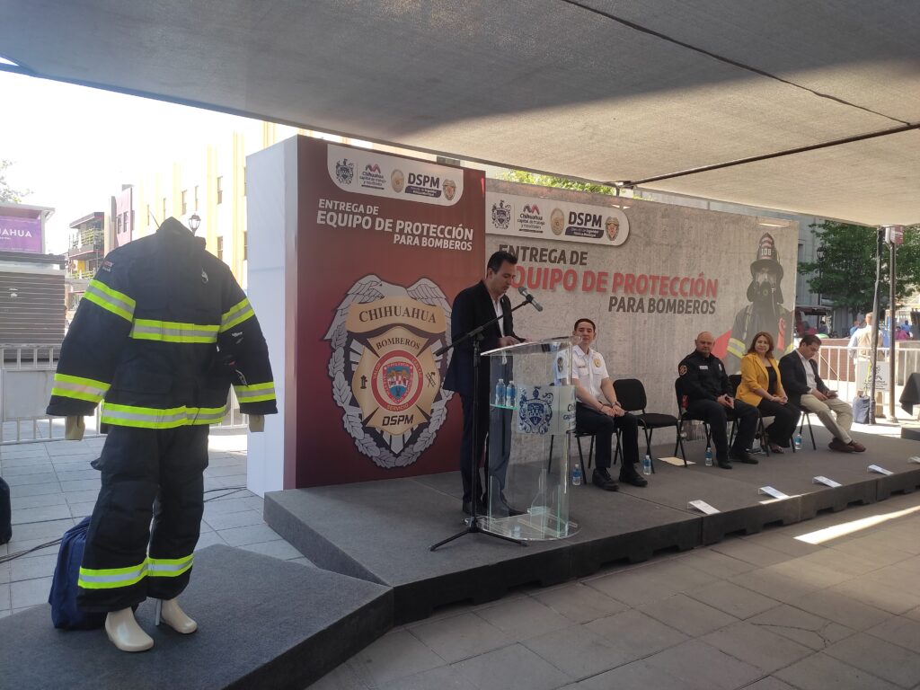 Chihuahua, Chih.- En evento encabezado por el Alcalde, Marco Bonilla, fueron entregados 170 equipos completos al Departamento de Bomberos de la Ciudad.