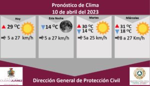 La Dirección General de Protección Civil, con base en informes del Servicio Meteorológico Nacional, pronostica un lunes soleado con una temperatura máxima de 29 grados Celsius, mientras que