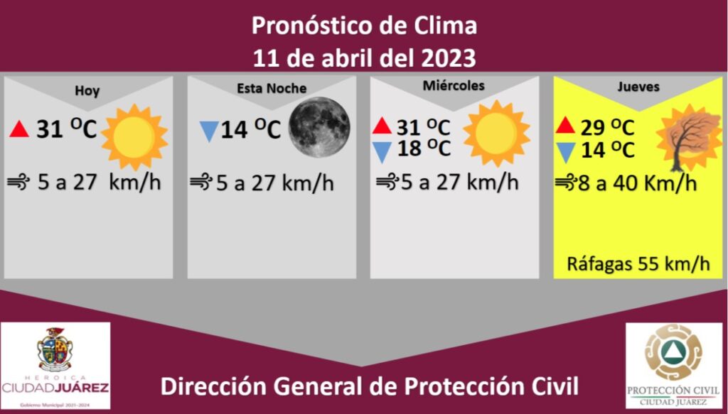 Roberto Briones Mota, titular de la dependencia, mencionó que la velocidad del viento oscilará de 5 a 27 kilómetros por hora, mientras que la probabilidad de lluvia se mantiene por debajo del 5 por ciento.