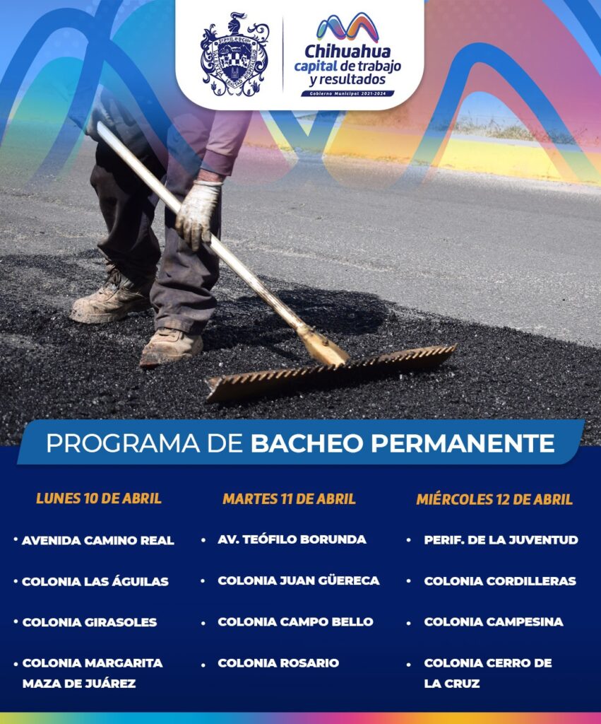 Chihuahua, Chih.- La Dirección de Obras Públicas exhorta a la ciudadanía a transitar con precaución debido a que este martes se llevará a cabo el programa de bacheo permanente en diferentes puntos de la ciudad.