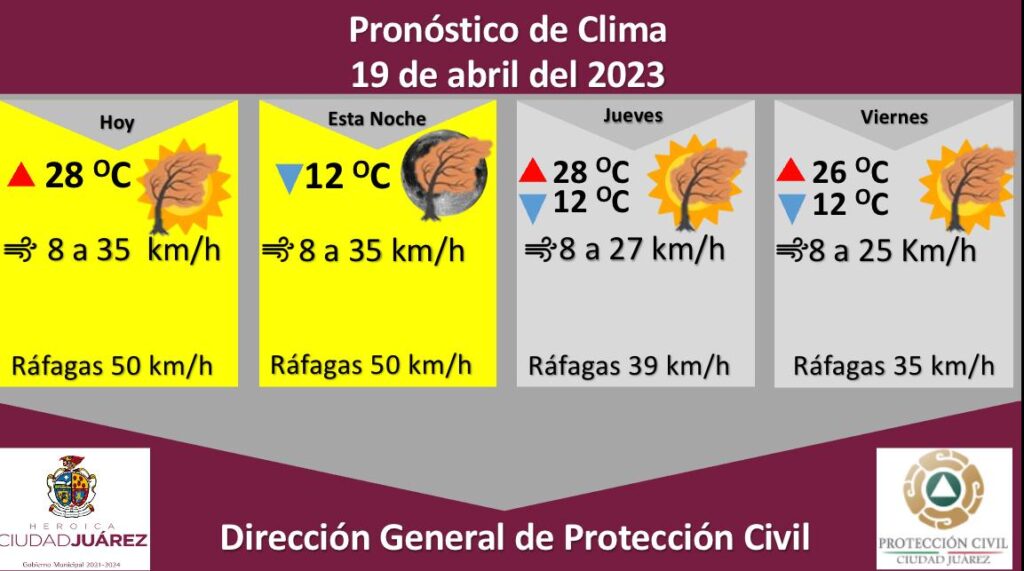 Para mañana jueves se esperan fuertes ráfagas de viento que alcanzarán los 39 kilómetros por hora, la temperatura máxima será de 28 °C y mínima de 12 °C, la velocidad del viento será de 8 a 27 kilómetros por hora.