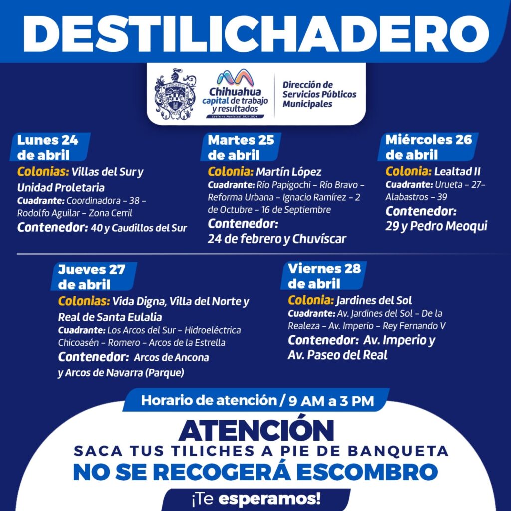 El Gobierno Municipal dio a conocer el calendario de las colonias que estará visitando el destilichadero en la ciudad de Chihuahua el cuál es el siguiente: