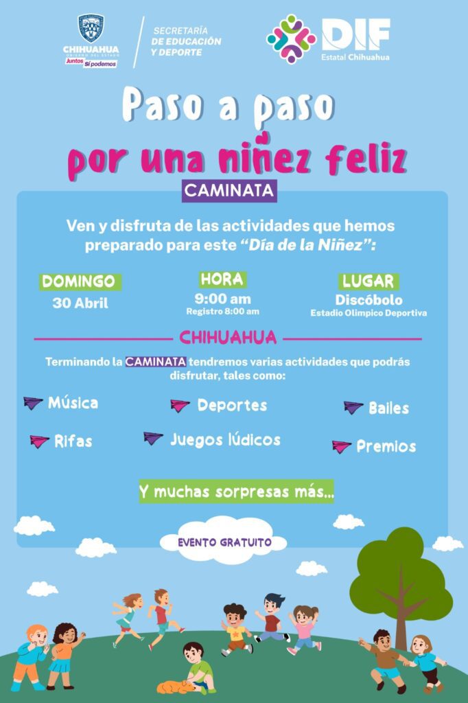 La campaña “Paso a paso por una niñez feliz”, iniciará en Chihuahua con una caminata el 30 de abril, en punto de las 8:30 horas en las instalaciones de la Ciudad Deportiva y al concluir la actividad, se ofrecerá la entrada gratis al parque “El Colibrí” para todas las personas que deseen asistir.