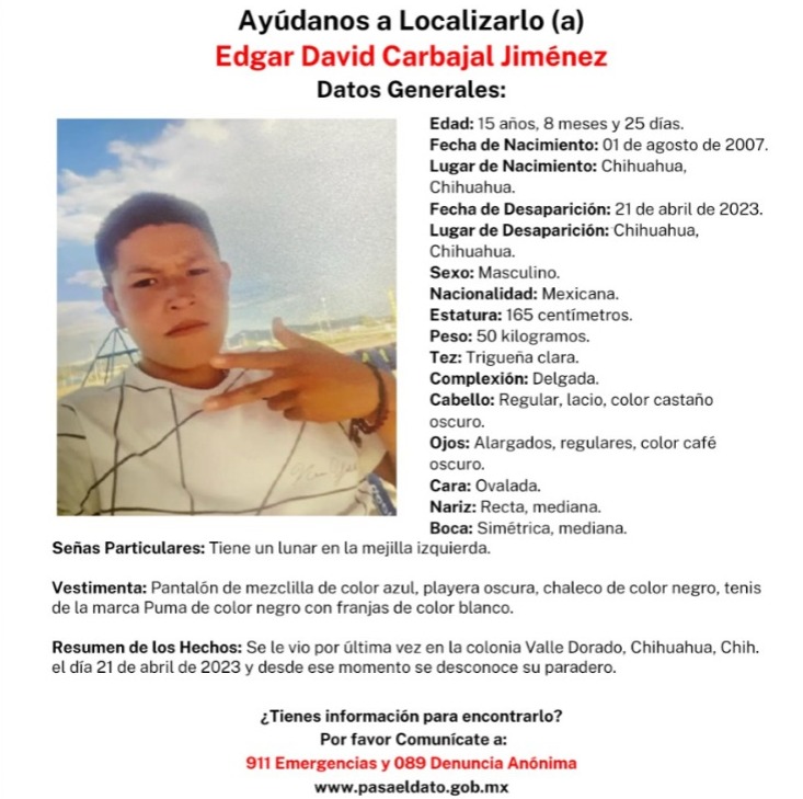Édgar David Carbajal Jiménez, de 15 años desapareció desde el pasado 21 de abril y no se sabe nada de su paradero, por lo que la Fiscalía emitió una ficha de búsqueda.