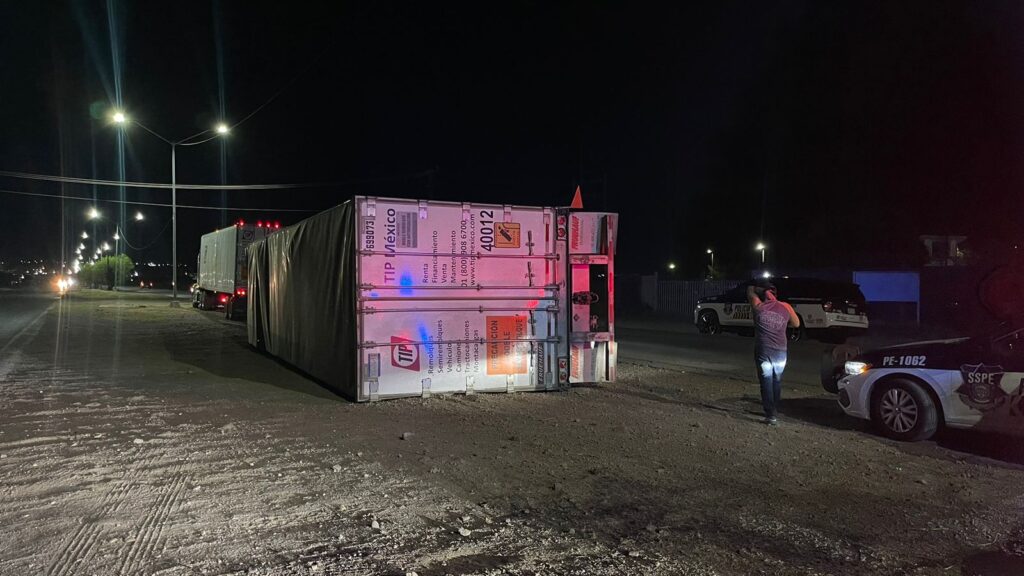 Pérdidas materiales dejó un accidente ocurrido sobre la carretera a Delicias, en el que el conductor de un tráiler vio como su caja de ladeaba hasta “acostarse”.
