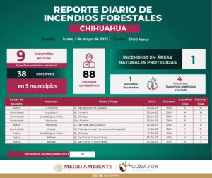 En base al reporte de incendios forestales a este lunes 1 de mayo, 88 combatientes se encuentran trabajando en 9 siniestros activos, que afectan 38 hectáreas en 5