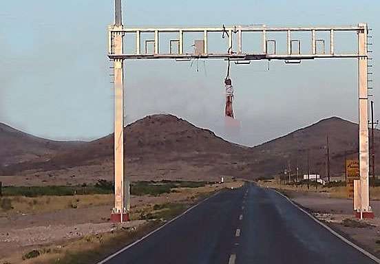 Este se encontraba en la carretera de Casas Grandes a Colonia Juárez y el cuerpo se encontraba suspendido de cabeza de la estructura que fue colocada por parte de una empresa que se encarga de la instalación de los arcos de seguridad.