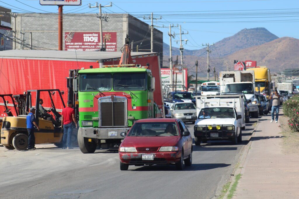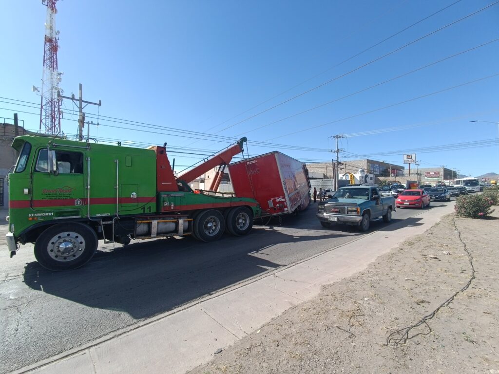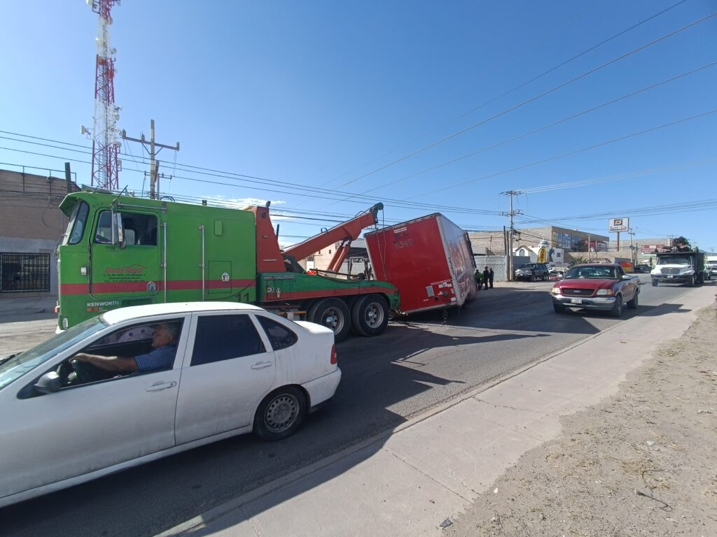 Volcadura de caja perteneciente a un tráiler provoca caos vial al Sur de la ciudad, en la avenida Juan Pablo Segundo en dirección Este a Oeste.