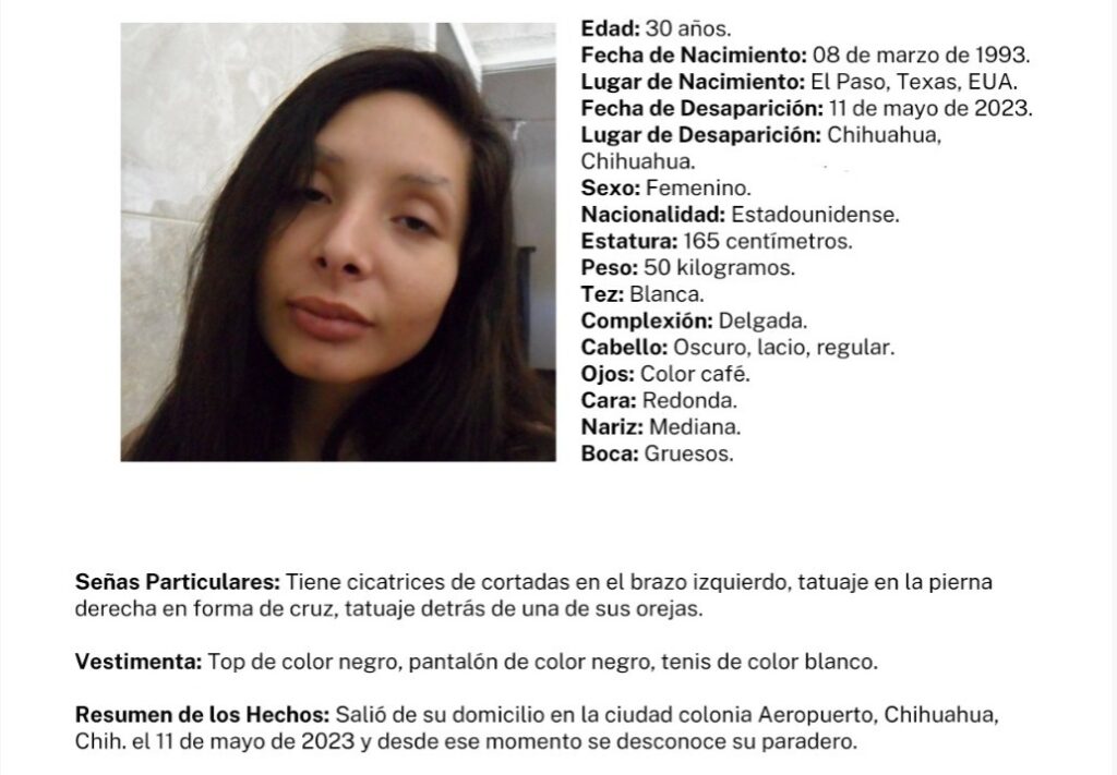 Una mujer de nacionalidad estadounidense, radicada en Chihuahua fue reportada como desaparecida por sus familiares, difundió la Fiscalía General del Estado.