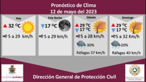 La Dirección General de Protección Civil, con base en informes del Servicio Meteorológico Nacional, pronostica una temperatura máxima de 32 grados Celsius para este viernes, mientras que la