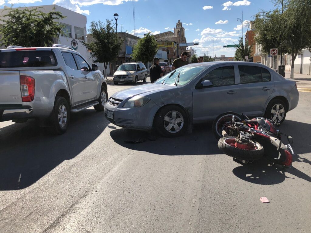 El encontronazo entre un motociclista y un auto compacto, dejó al primero con lesiones considerables, esto en calles del centro de la ciudad.