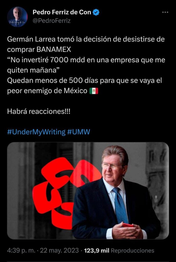 Germán Larrea tomó la decisión de desistirse de comprar BANAMEX “No invertiré 7000 mdd en una empresa que me quiten mañana” Quedan menos de 500 días para que se vaya el peor enemigo de México