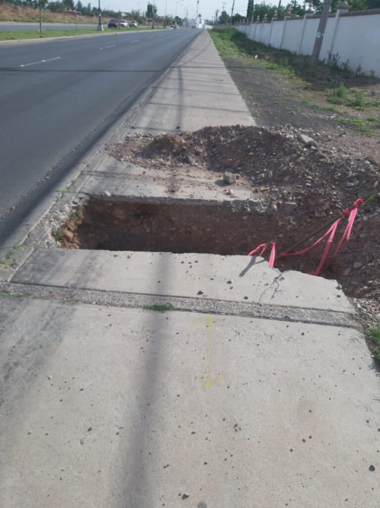 Chihuahua, Chih.- Radioescuchas de Radio Noticias 91.7 y seguidores de enblancoynegro.com.mx reportaron un mega socavón en una tramo del sendero para transeúntes ubicado en la Avenida Palestina cerca de la Hacienda de Samotracia.
