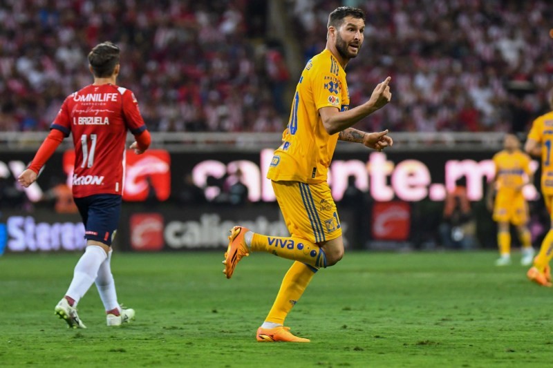¡Gooooool! de Tigres y mueve el marcador a favor 3-2 sobre Chivas del Guadalajara 2. Guido Pizarro (Tigres UANL) remate de cabeza desde el centro del área tras un saque de esquina.