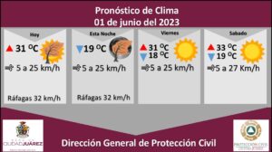La Dirección General de Protección Civil, con base en informes del Servicio Meteorológico Nacional, pronostica fuertes ráfagas de viento de hasta 32 kilómetros por hora para este jueves,