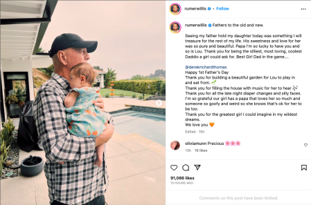 A través de sus redes sociales, la hija de Bruce Willis compartió un tierno mensaje al actor: “Ver a mi padre abrazar a mi hija hoy fue algo que atesoraré por el resto de mi vida”, escribió la mayor de sus hijas con Demi Moore. “Su dulzura y amor por ella era tan puro y hermoso”, añadió.