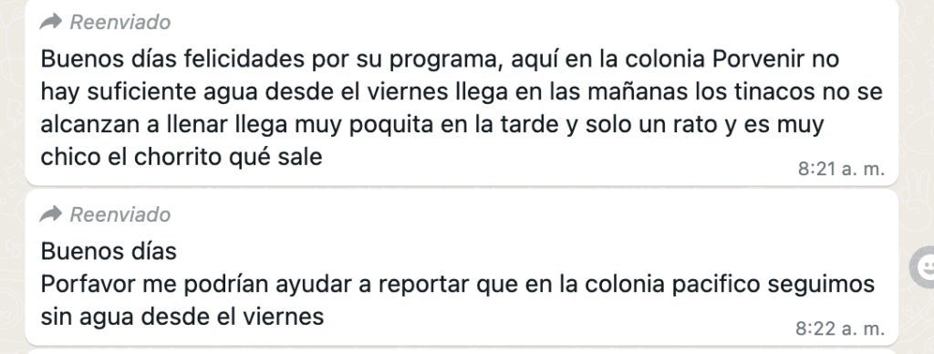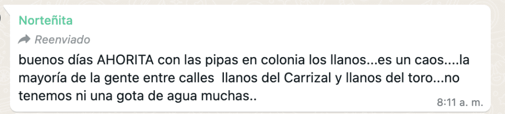 Asimismo se reitera la prestación del servicio gratuito de pipas en aquellas colonias donde se requiera, teniendo a disposición un total de 37 pipas propios y 10 más externas para llevar agua a quienes así lo soliciten a través del teléfono 073, y los números de WhatsApp 614-255-09-94 y 614-188-27-33.