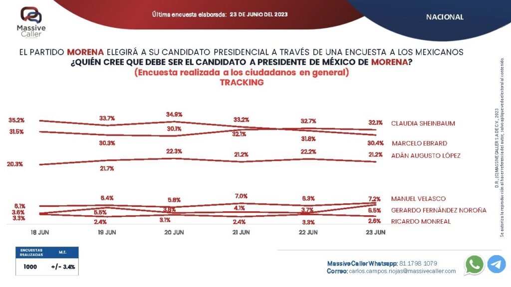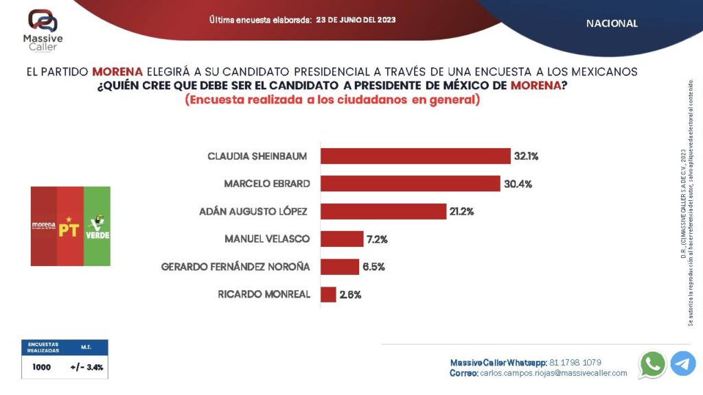 Ciudad de México.- La casa encuestadora “Massive Caller” dio a conocer sus últimas estadísticas a la pregunta ¿Quién cree que debe ser el candidato a presidente de México de Morena? dando como resultado una ligera ventaja para Claudia Sheinbaum de casi dos puntos sobre Marcelo Ebrard.