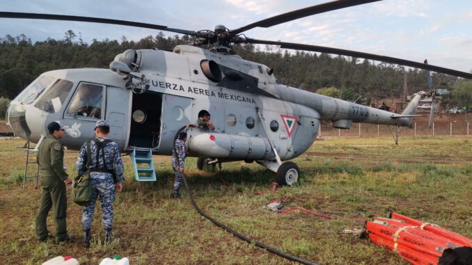 Como ayuda adicional, en las últimas horas arribó a ciudad Madera un equipo especial a bordo de un helicóptero MI 17, de la Sedena, que realiza descargas de agua y de retardante con la ayuda de un helibalde o “bambi bucket”, que tiene una capacidad de 2 mil 500 litros.