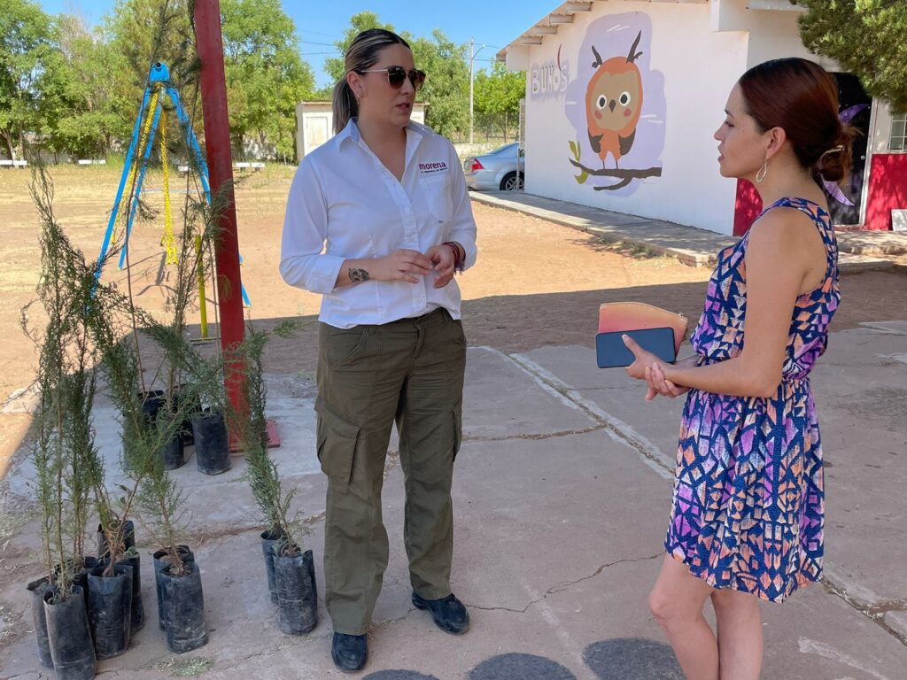 Nuevo Casas Grandes. – Comprometida con el cuidado del medio ambiente y como una medida para ayudar a contrarrestar el cambio climático la diputada local por Morena, América García, hizo entrega de más de 80 árboles en escuelas de nivel básico.