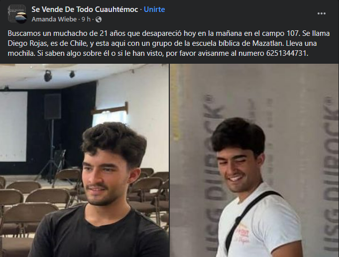 Según testigos, el hombre de 21 años de edad procedente del país sudamericano y que tiene como nombre Diego Rojas desapareció cuando se encontraba en el campo menonita 107.