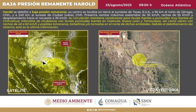 La depresión tropical Harold en combinación con el monzón mexicano, ocasionará lluvias puntuales a fuertes sobre localidades ubicadas en la zona norte del territorio estatal, dio a conocer