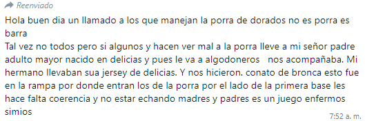 Chihuahua, Chih.- Usuarios denunciaros el actuar del grupo de animación de los Dorados de Chihuahua, indicando que durante el inicio de la gran final del Campeonato Estatal de Beisbol ante los Algodoneros de Delicias le hicieron bronca a un adulto mayor y su familia por irle al equipo contrario.