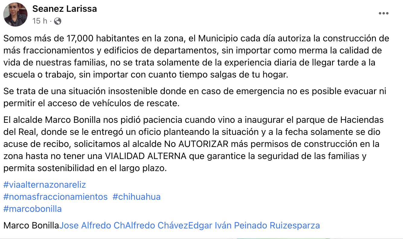 Parece ser que la historia de Valle Escondido estará por repetirse pero ahora por la zona de El Reliz ya que el Gobierno Municipal no para de otorgar licencias y permisos para construcción de nuevos fraccionamientos cuando sólo existe una vía vehicular para salir del lugar, lo que está ocasionando embotellamientos en la Teófilo Borunda.