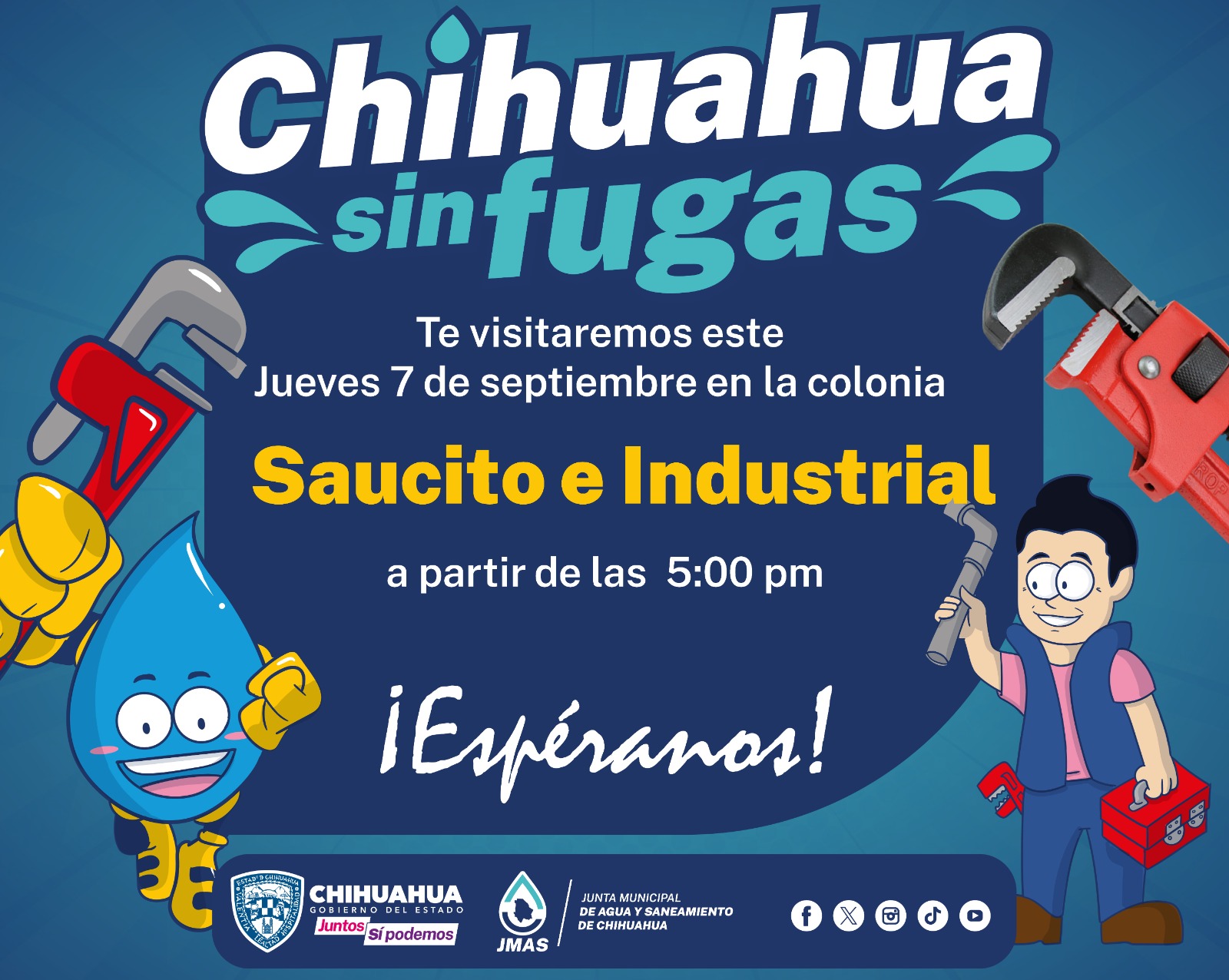 La Junta Municipal de Agua y Saneamiento (JMAS) de Chihuahua anunció que estará visitando este jueves las colonias Industrial y Saucito para llevar el programa “Chihuahua Sin Fugas”
