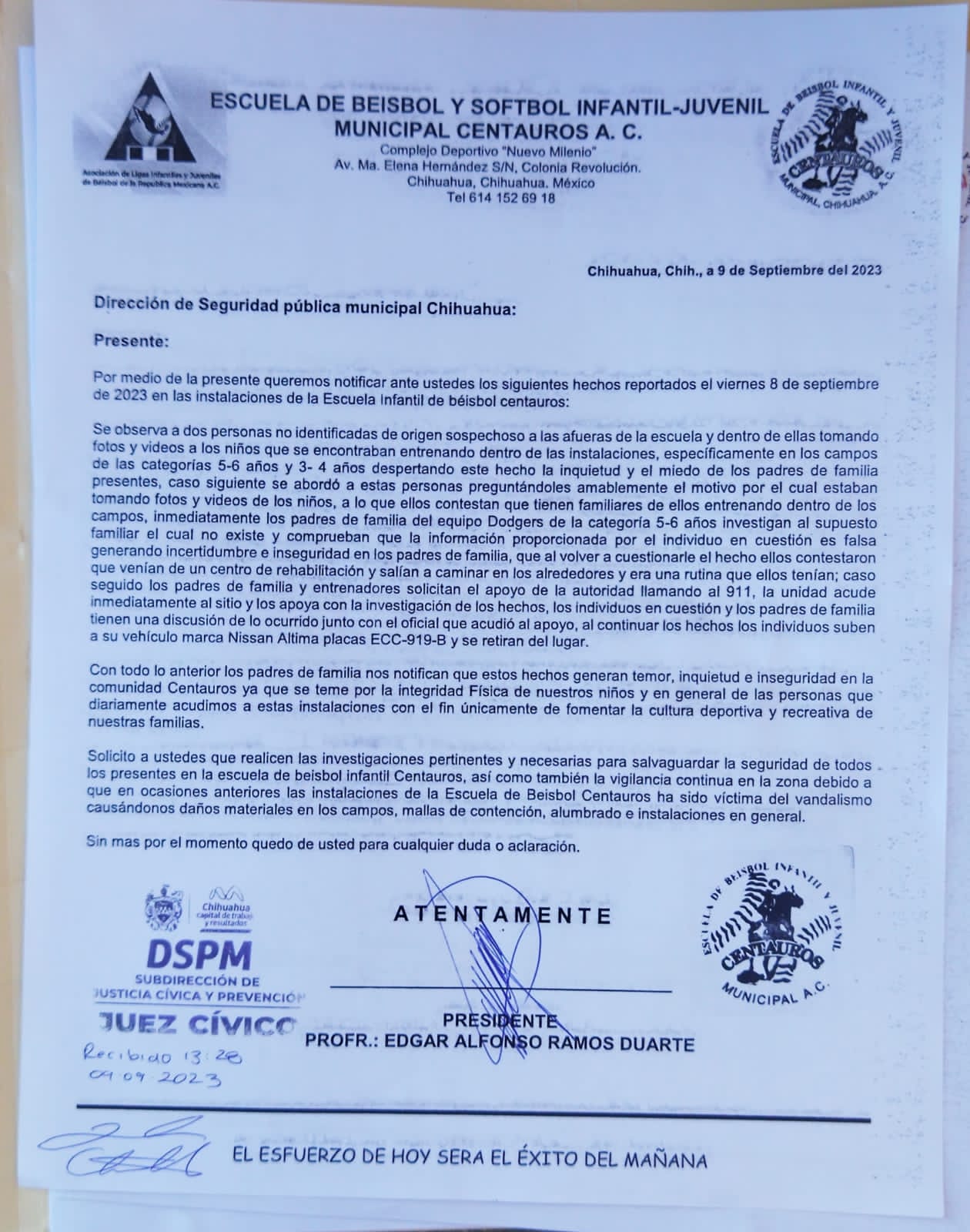 Incluso los padres de familia y la Escuela de Beisbol Centauros mandaron un oficio a la Dirección de Seguridad Pública Municipal solicitando mayor una investigación y mayor vigilancia ante diversos actos de vandalismo que se han sufrido las instalaciones de la escuela deportiva.