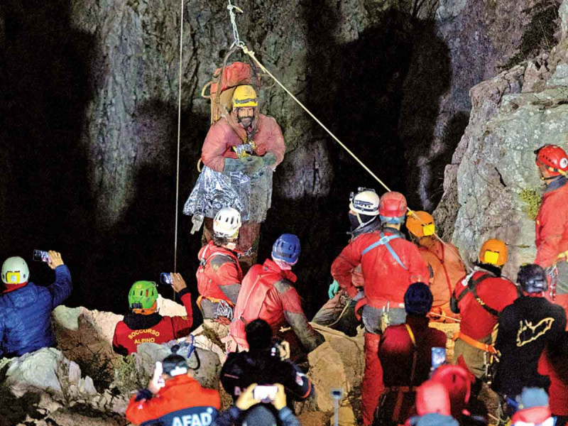 Al menos 150 unidades de salvamento procedentes de seis países se requirieron para sacar de la cueva a Mark Dickey, quien ascendió en camilla Más de 150 rescatistas