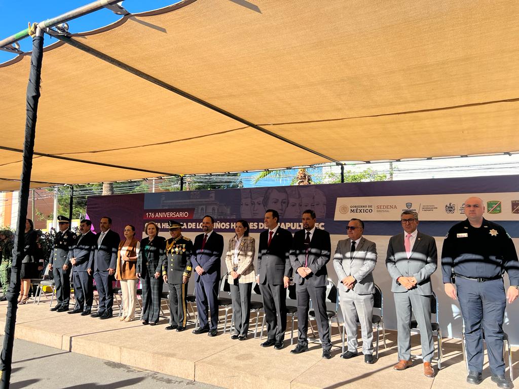 Hoy, 13 de septiembre, se conmemoró el aniversario de los Niños Héroes de Chapultepec en una emotiva ceremonia llevada a cabo en la V Zona Militar. El evento contó con la presencia de destacados funcionarios, entre ellos el Secretario de Hacienda en representación de la Gobernadora, el Alcalde Marco Bonilla y el Presidente de la Canaco, entre otros distinguidos invitados.