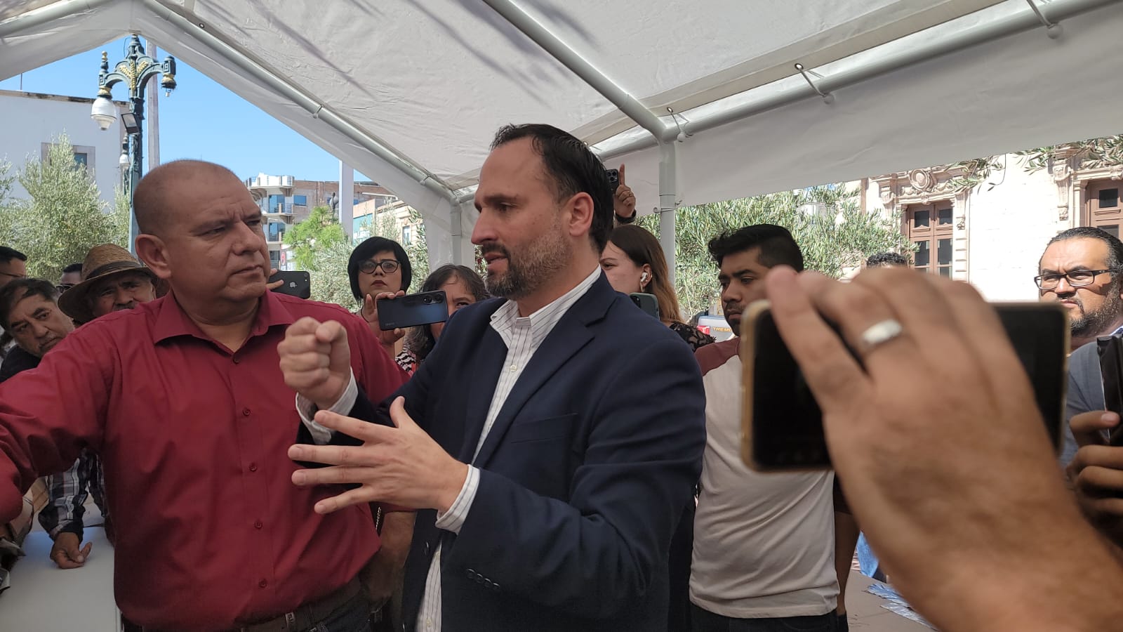 El secretario general de gobierno, Santiago de la Peña Grajeda, atendió a los legisladores de Morena que acudieron a la Plaza Hidalgo para hacer entrega de miles de
