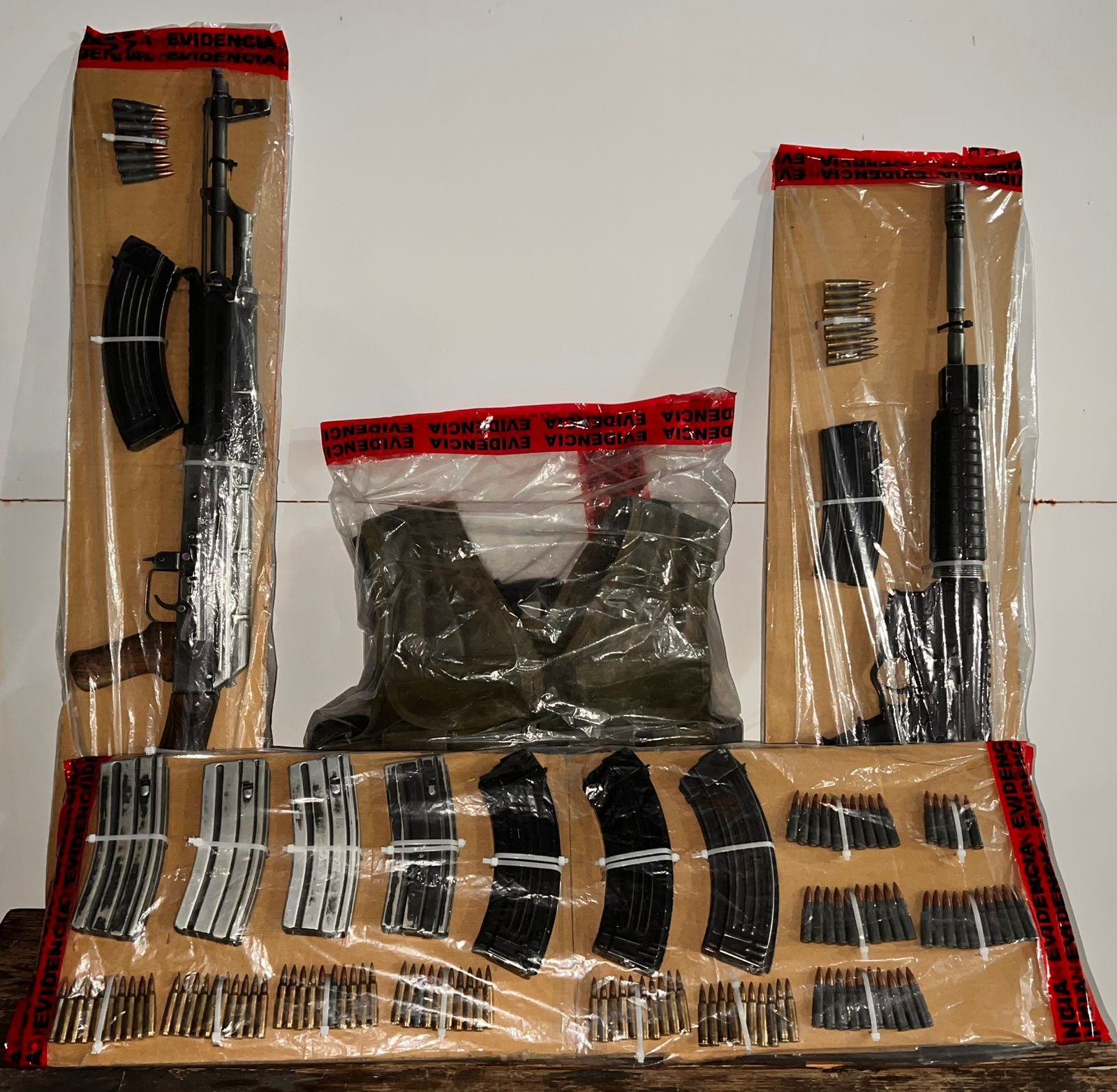 Como resultado de las acciones, los elementos lograron la detención de dos individuos identificados como José Omar G. M., de 18 años de edad, y Roberto Carlos P. M., de 31 años. Además, se incautaron dos armas de fuego de grueso calibre, nueve cargadores y 122 cartuchos útiles y un chaleco táctico.