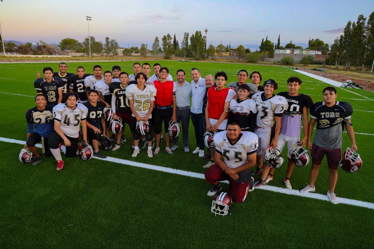 Chihuahua Chih.- El alcalde Marco Bonilla Mendoza, realizó una visita de supervisión a la cancha de futbol americano del Centro de Bachillerato Tecnológico Industrial y Servicios (CBTIS) número