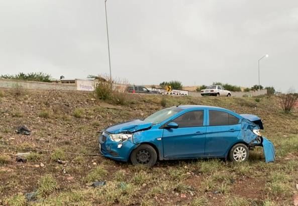 A causa del exceso de velocidad y el pavimento mojado, la conductora de un vehículo compacto volcó mientras circulaba sobre el periférico R. Almada. El vehículo accidentado es