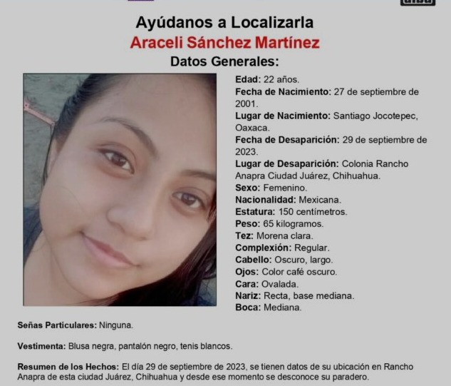 La Fiscalía Especializada en Atención a Mujeres Víctimas del Delito por Razón de Género y a la Familia, Zona Norte, solicita ayuda de la ciudadanía para localizar a