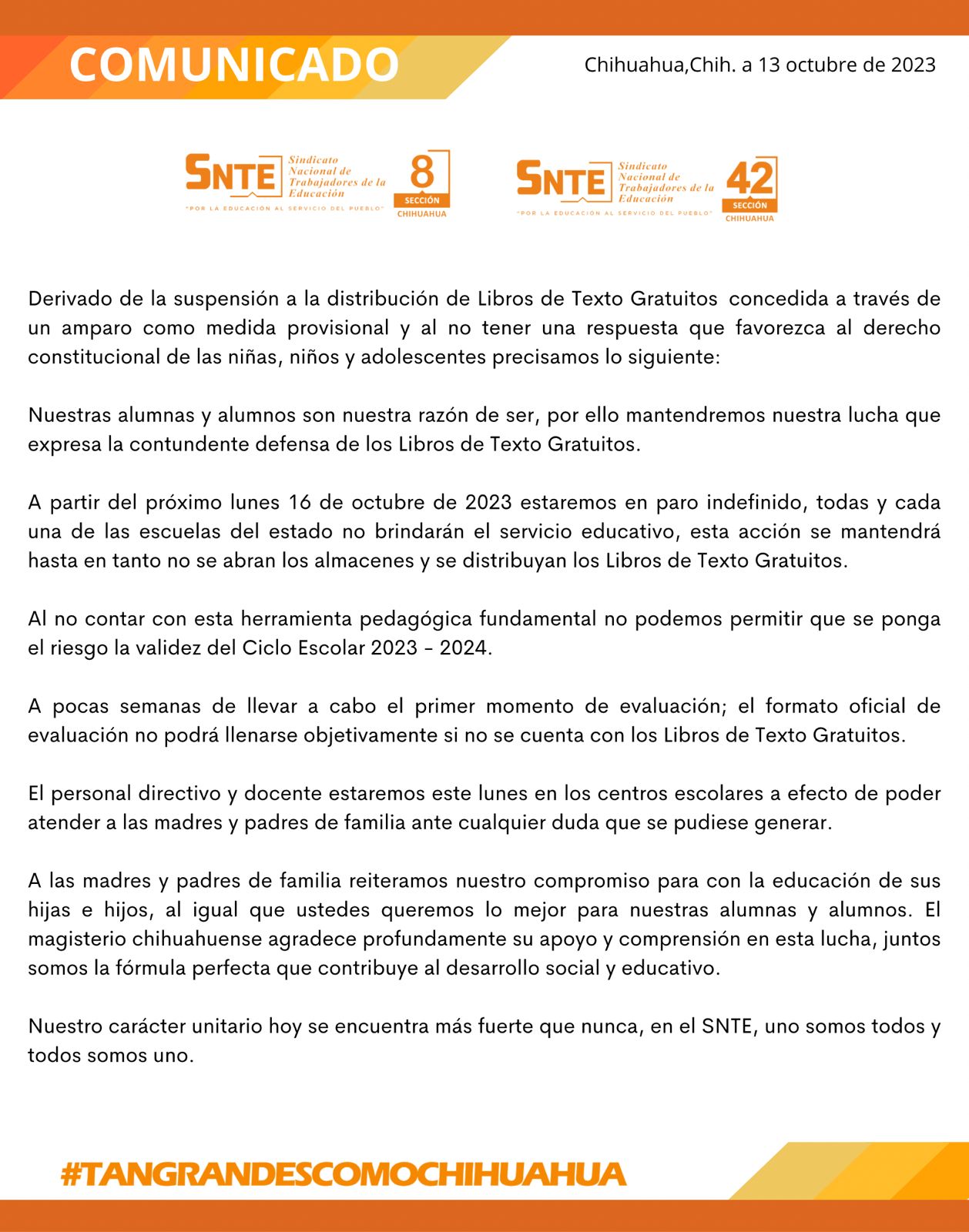 A través de un comunicado firmado por las secciones 8 y 42 del Sindicato Nacional de Trabajadores de la Educación, se dio a conocer que el próximo lunes