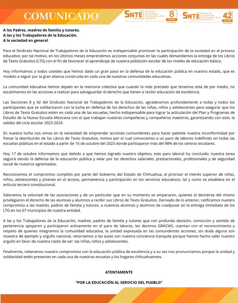 A través de un comunicado de prensa, las secciones 8 y 42, del Sindicato Nacional de Trabajadores de la Educación dieron a conocer su reconocimiento a las partes