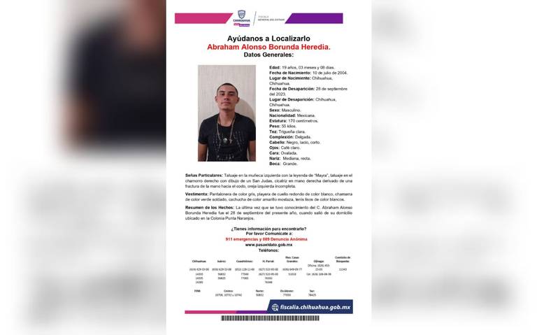 La fiscalía estatal emitió la ficha de búsqueda de Abraham Alonso Borunda ya que no se sabe de el desde el 28 de septiembre, cuando se encontraba en