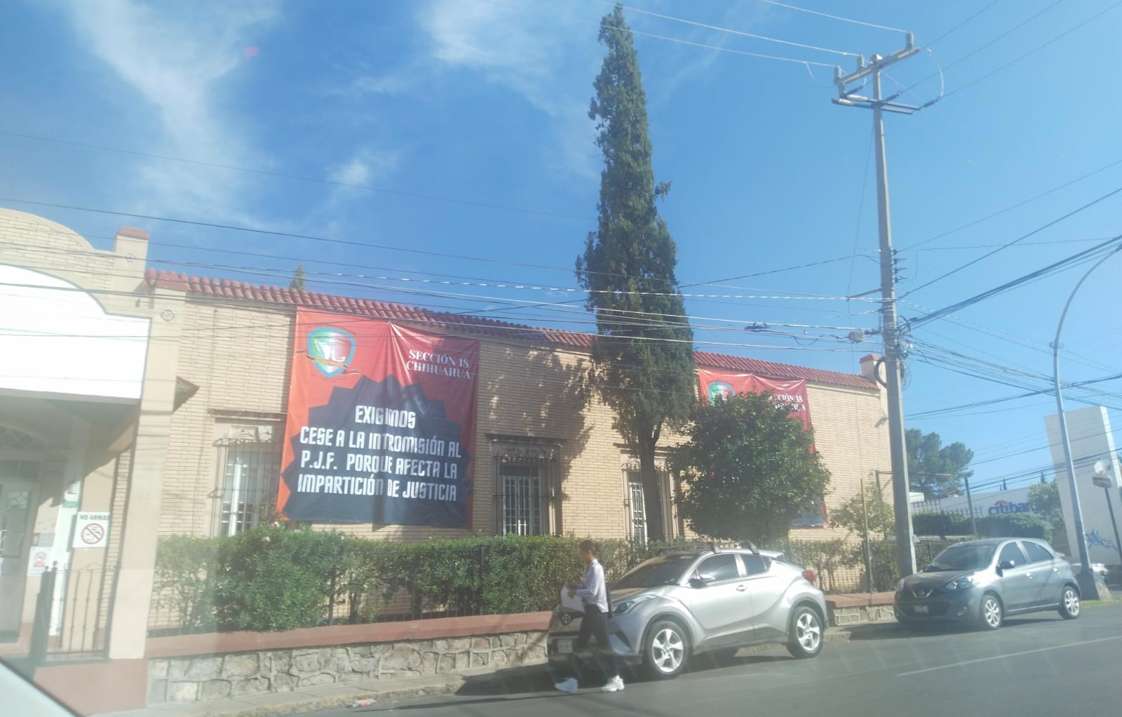 En las instalaciones de la Casa Jurídica de Chihuahua, fueron colocadas lonas de protesta por parte de empleados que se dicen inconformes con la cancelación de fideicomisos como