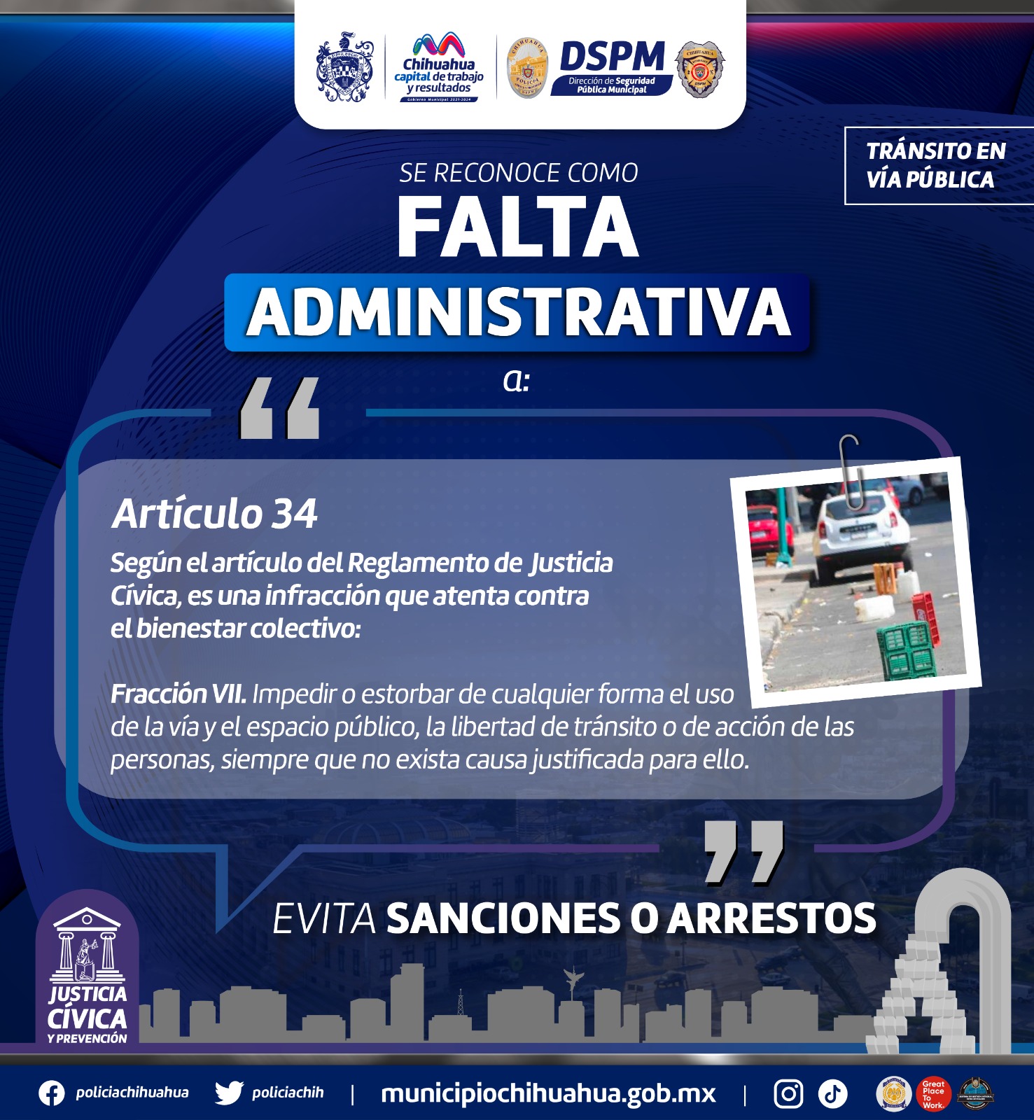Chihuahua Chih.- Dentro del Reglamento de Justicia Cívica del Gobierno Municipal, el impedir o estorbar el libre tránsito constituye una falta administrativa, que de sanciona con una multa