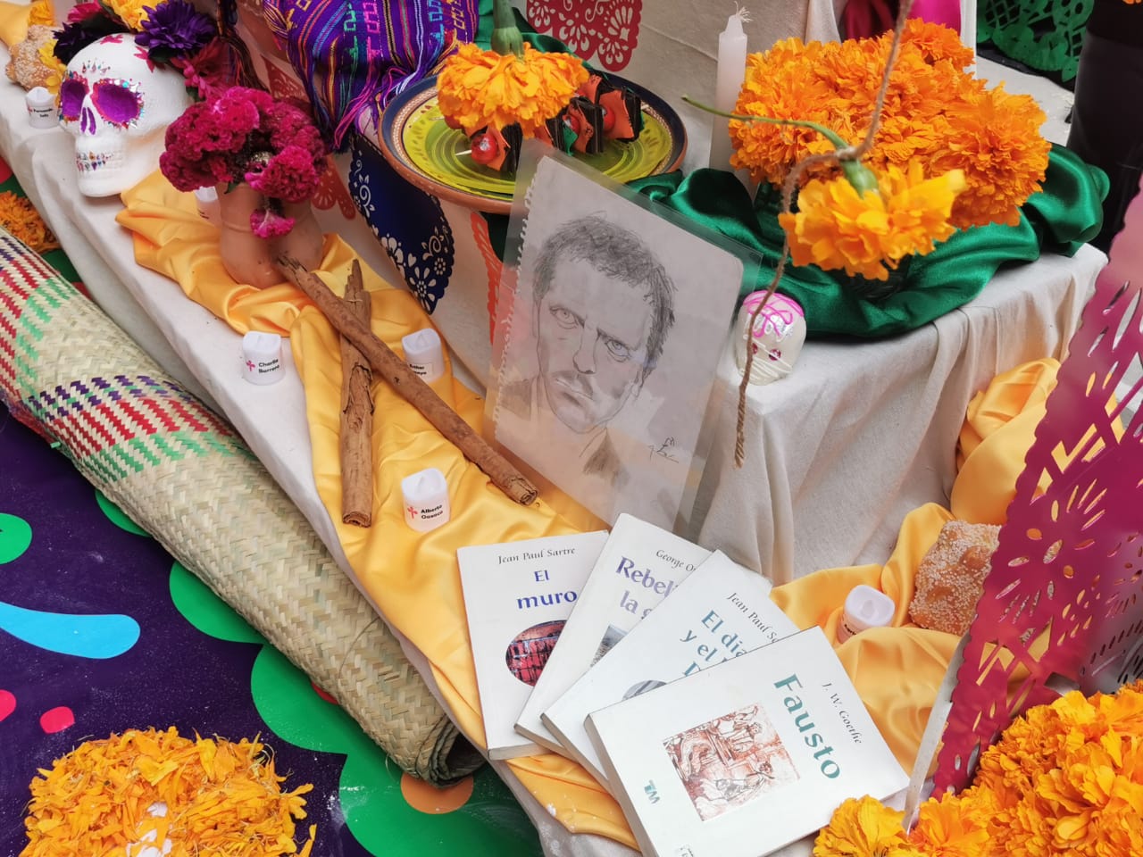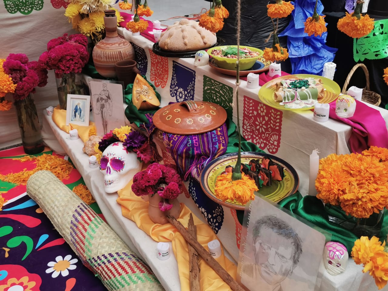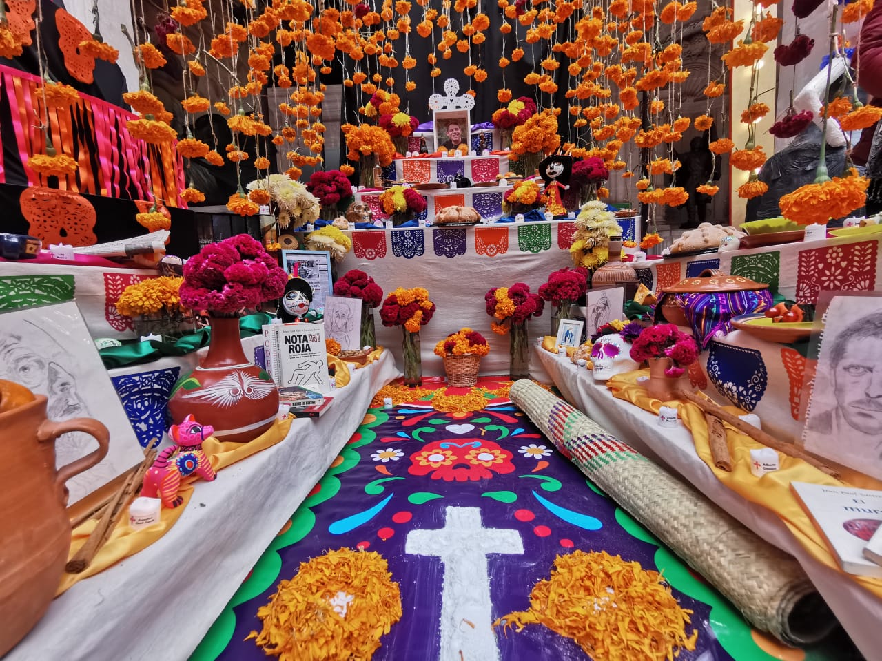 La ofrenda, dedicada al recordado comunicador, incluye elementos simbólicos como pan de muerto, calaveras, flores de cempasúchil, papel picado, veladoras y diversos artículos que formaban parte de su vida cotidiana. Los familiares contribuyeron con libros, dibujos y ejemplares de las notas periodísticas publicadas con su nombre en El Heraldo de Chihuahua.